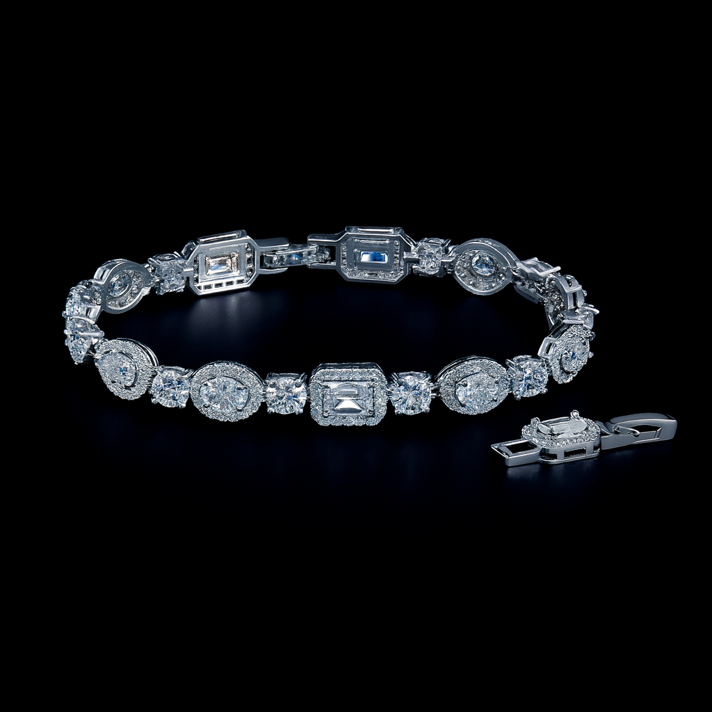 Bransoletka Iced Mix White to połączenie nowoczesnego designu i klasycznej elegancji. Unikalna kompozycja różnorodnych kształtów kamieni – od owalnych po prostokątne – nadaje jej wyjątkowego charakteru i niepowtarzalnego blasku. Wykonana z precyzją właściwą najlepszym wyrobom jubilerskim, stanowi idealny wybór dla osób ceniących oryginalność w luksusowym wydaniu.