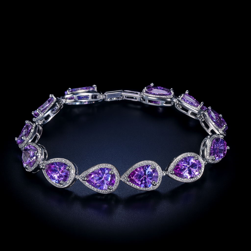 Bransoletka Iced Teardrop Purple to wyraz elegancji w nowoczesnym wydaniu. Jej głęboki, fioletowy odcień symbolizuje luksus i pewność siebie, a precyzyjnie szlifowane cyrkonie w kształcie łez nadają całości wyjątkowego charakteru. Doskonała dla osób, które cenią wyrafinowany styl i biżuterię o niepowtarzalnym blasku.