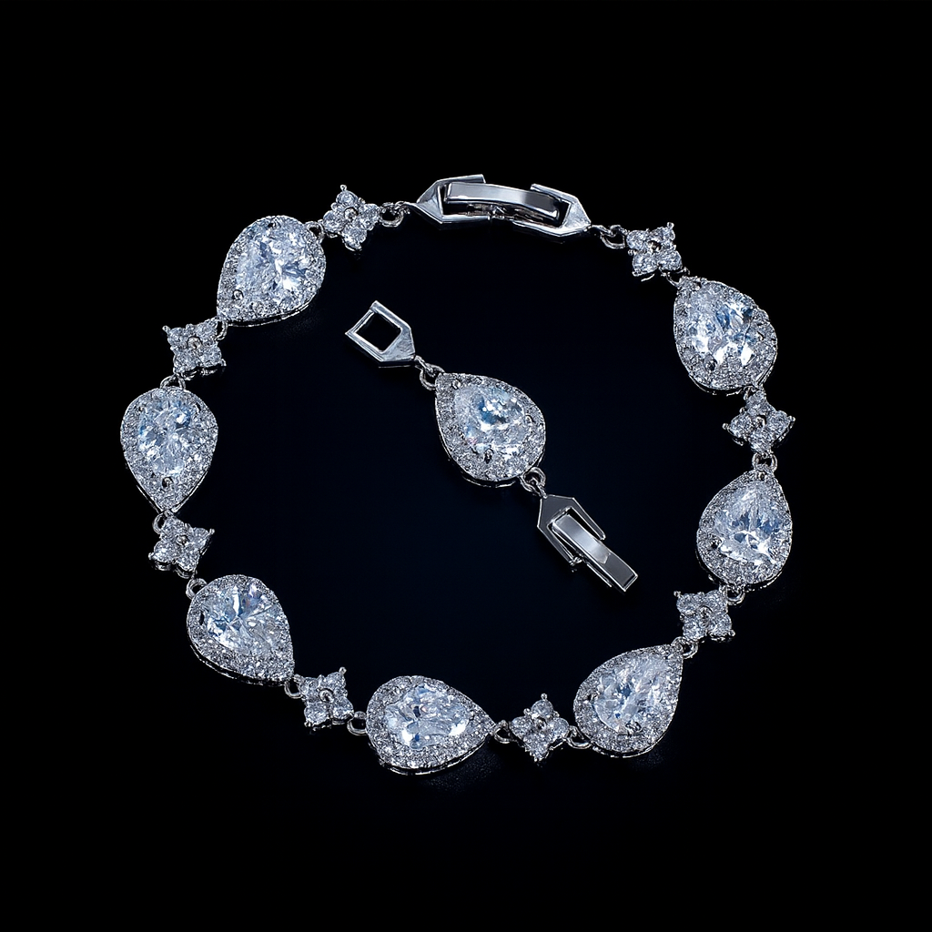 Kamienie w kształcie łez, precyzyjnie osadzone w jubilerskiej oprawie